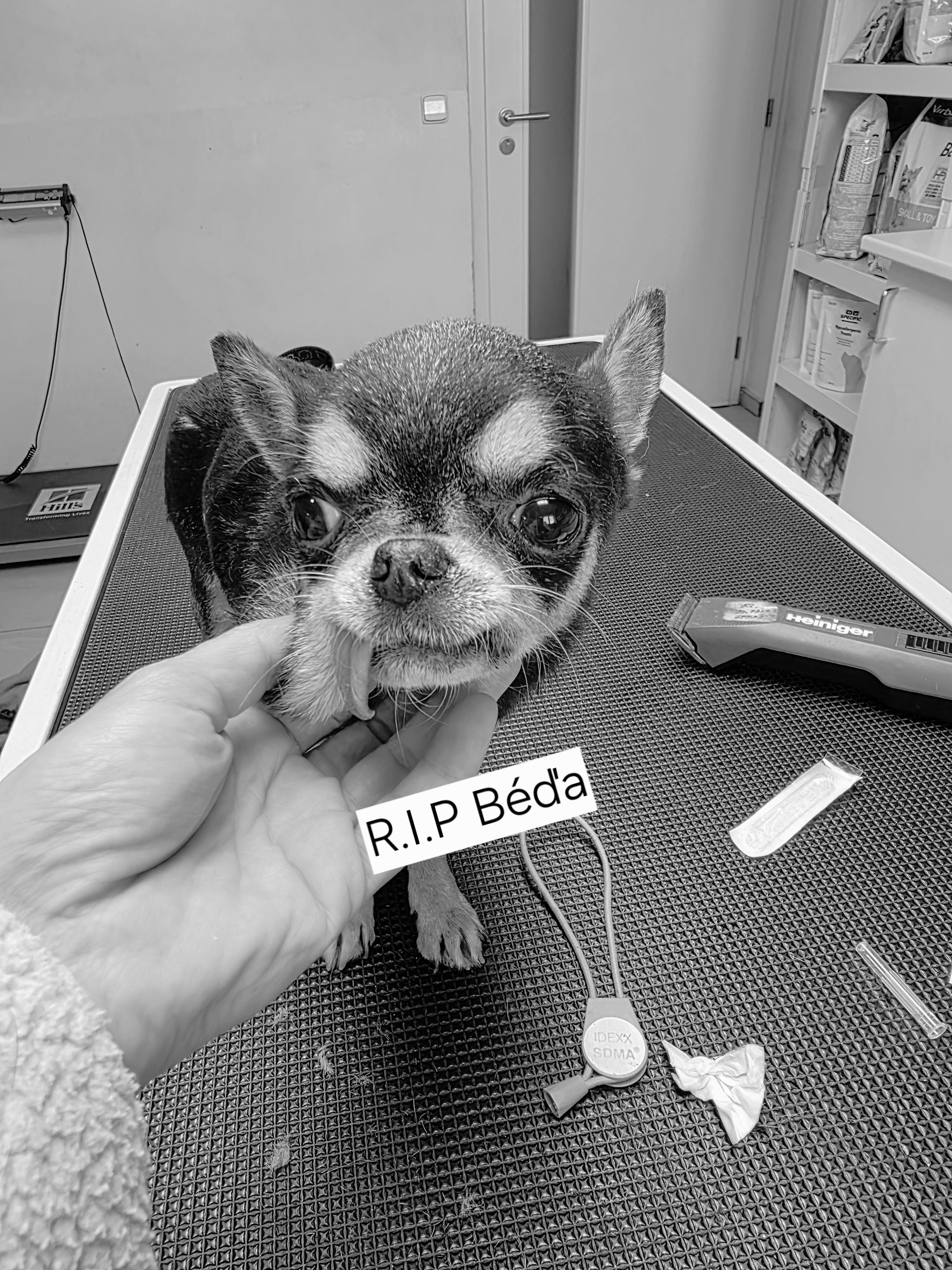 Béďu jsem převzala po zemřelém majiteli z otřesných podmínek. Od začátku velmi špatně dýchal a byl hubený. Bohužel se při veterinární kontrole zjistila voda na plicích, pneumonie a v krevních testech vyšlo selhání ledvin. Jeho stav byl velmi vážný. Dostal antibiotika, ale paní doktorka řekla, že je to moc špatné 😪. Doma se napapal a spokojeně usnul …. bohužel už napořád 😭😭😭. ….